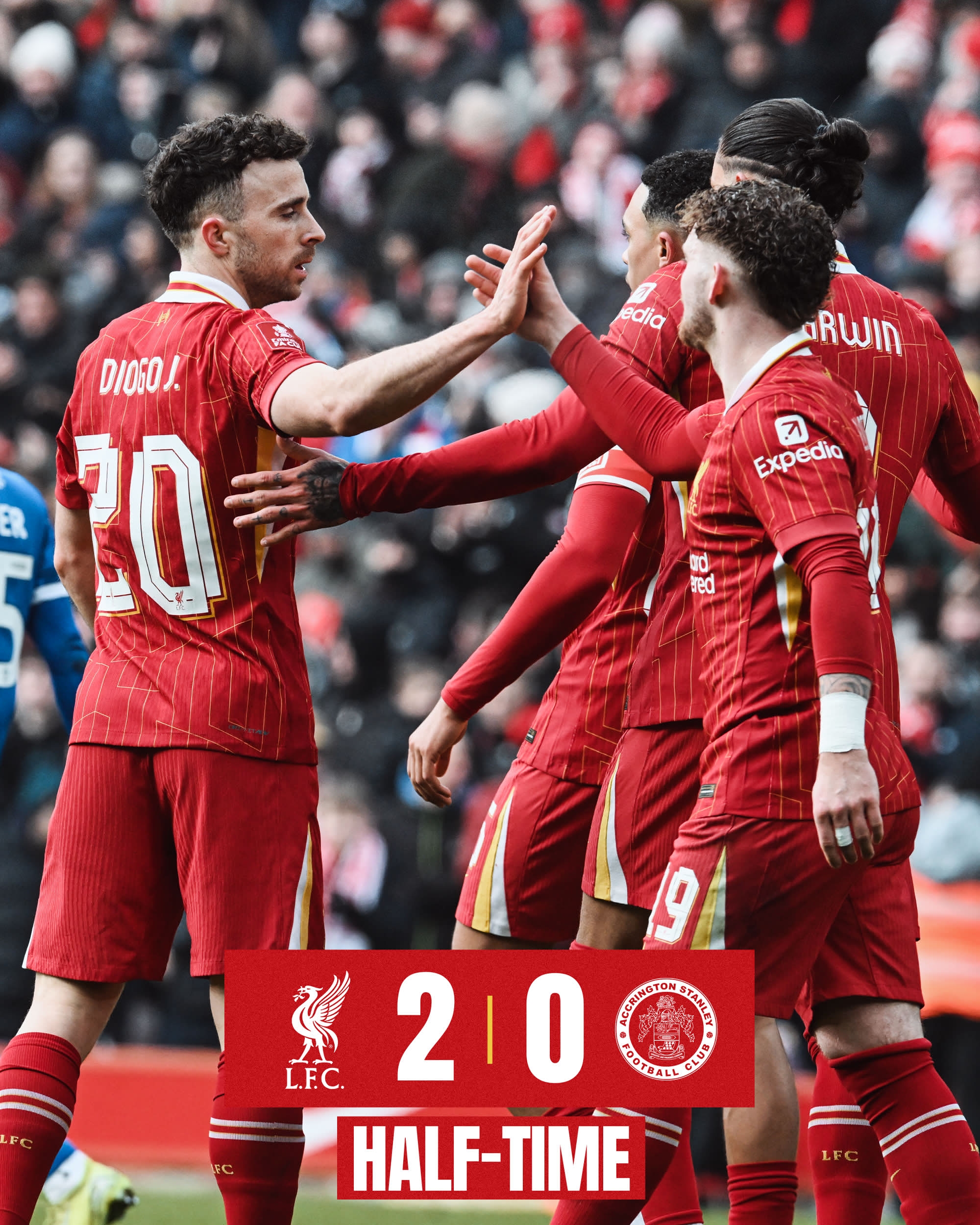 傷停補(bǔ)時(shí)2分鐘。上半場(chǎng)比賽結(jié)束,利物浦2-0阿克靈頓。