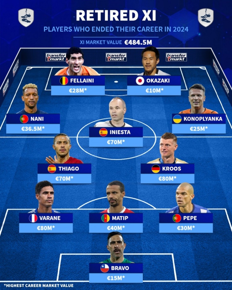 德轉(zhuǎn)列2024年退役陣容(巔峰德轉(zhuǎn)身價,總價4.845億歐):