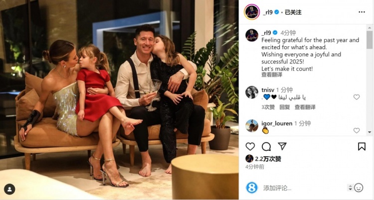 發(fā)布時(shí)間:2025年01月01日 14:16點(diǎn)擊:欄目:足球新聞 1月1日訊 巴薩前鋒萊萬更新社媒動(dòng)態(tài),送上新年祝福。萊萬社媒曬出與家人的合照,并寫道:“對(duì)過去的一年心存感激,對(duì)未來充滿期待?!?/p>“祝大家2025年快樂、成功!讓我們把它變得有意義!”萊萬本賽季為巴薩出戰(zhàn)24場(chǎng)比賽,打進(jìn)23球,送出2記助攻。 除特別注明外,本站所有內(nèi)容均為九球直播整理排版,轉(zhuǎn)載請(qǐng)注明出處:萊萬新年祝詞:對(duì)未來充滿期待,祝大家2025年快樂、成功! 本文標(biāo)簽: 足球 西甲 巴塞羅那 萊萬