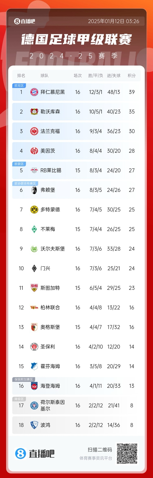 發(fā)布時(shí)間:2025年01月12日 03:50點(diǎn)擊:欄目:足球新聞 01月12日訊 德甲第16輪,拜仁慕尼黑客場(chǎng)1-0戰(zhàn)勝門興。積分榜方面,拜仁4分優(yōu)勢(shì)領(lǐng)跑,鎖定德甲半程冠軍。 除特別注明外,本站所有內(nèi)容均為九球直播整理排版,轉(zhuǎn)載請(qǐng)注明出處:德甲積分榜:拜仁4分優(yōu)勢(shì)領(lǐng)跑,鎖定德甲半程冠軍 本文標(biāo)簽: 足球 德甲 拜仁慕尼黑 門興