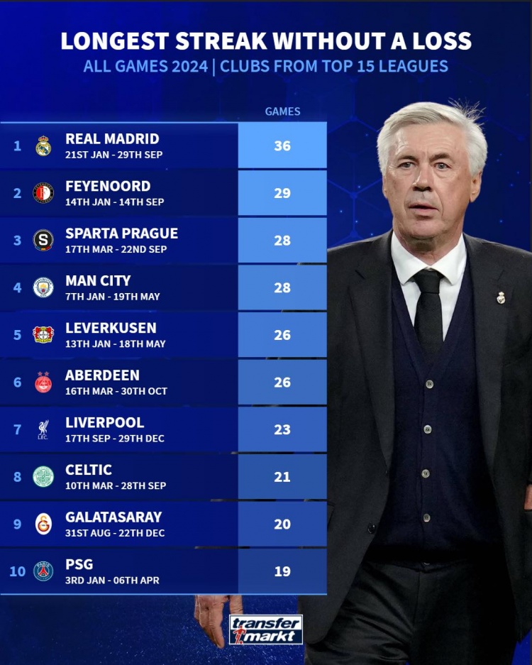 1月12日訊 德國轉(zhuǎn)會市場統(tǒng)計(jì)了前15名聯(lián)賽球隊(duì)2024年的戰(zhàn)績,并列出2024年最長不敗排名,皇馬36場不敗居首,費(fèi)耶諾德29場不敗次席,曼城28場不敗,勒沃庫森26場不敗。