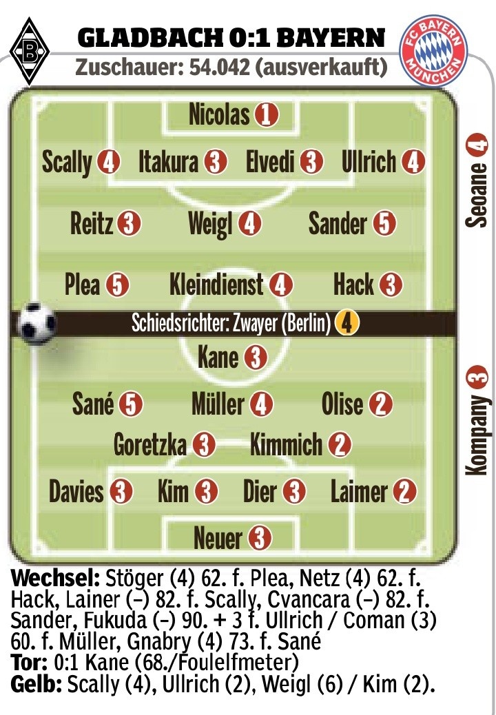 1月12日訊 德甲第16輪比賽,拜仁客場1-0擊敗門興,《圖片報》對兩隊球員進行了評分,門興門將尼古拉斯1分最高,薩內(nèi)5分并列最低。