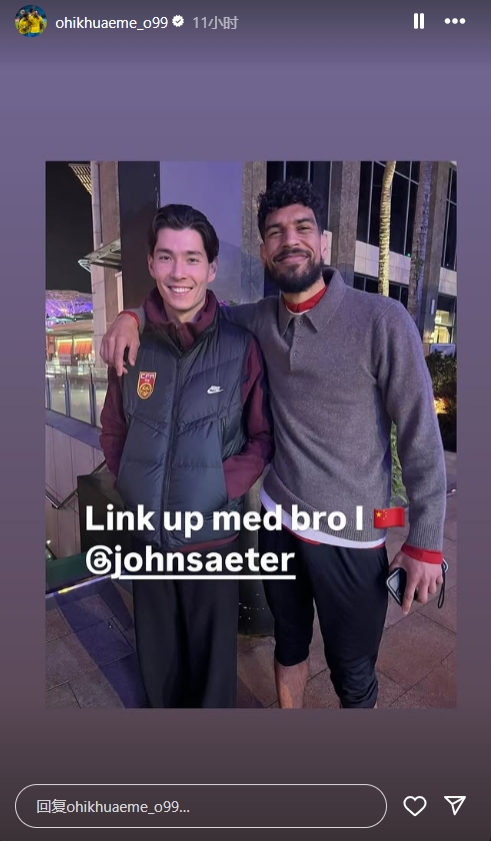 奧莫伊胡安弗曬出了他與自己挪威老鄉(xiāng)侯永永的合影并配文寫(xiě)道:“兄弟,我們?cè)谥袊?guó)繼續(xù)聯(lián)系?!?/p>