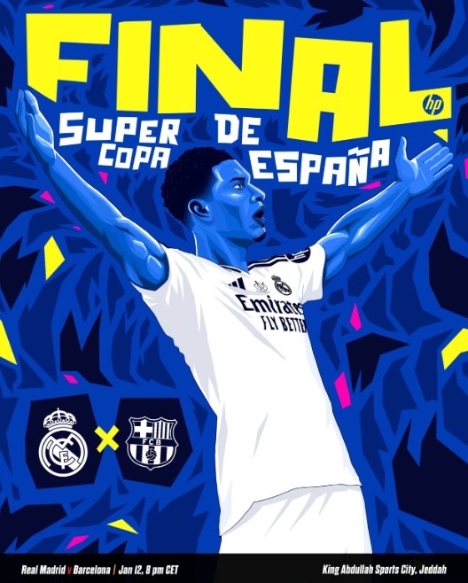 賽前,皇馬官方曬出海報(bào),為本場比賽預(yù)熱。貝林厄姆以漫畫版的標(biāo)志性慶祝動(dòng)作“君臨天下”出鏡,海報(bào)上方為賽事類型,左下角為對(duì)陣雙方隊(duì)徽,最下方為開球時(shí)間以及比賽場地。