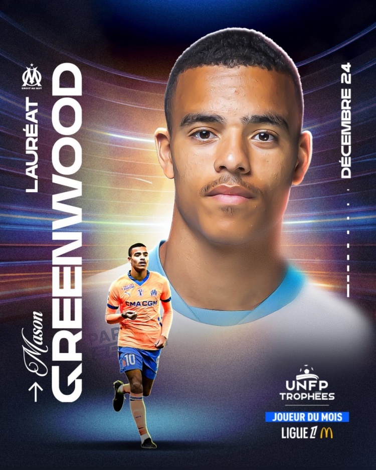 1月12日訊 據(jù)官方消息,馬賽前鋒格林伍德當(dāng)選UNFP(法國職業(yè)球員工會(huì))法甲12月最佳球員。