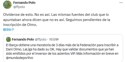 Fernando Polo發(fā)文稱巴薩獲得了西足協(xié)3天延期來(lái)完成奧爾莫的注冊(cè),西甲聯(lián)盟也同意了。巴薩出售諾坎普VIP席位的文件還需獲得驗(yàn)證。不過(guò),他隨后更新消息:“忘記這事吧。情況不是這樣的。同一位俱樂(lè)部消息人士現(xiàn)在說(shuō)情況不是這樣的。我們?nèi)栽诘却龏W爾莫的注冊(cè)?!?/p>