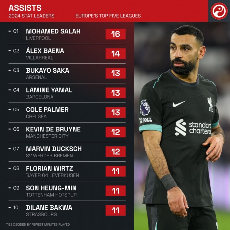1月1日訊 Squawka統(tǒng)計了五大聯(lián)賽2024年的助攻榜,薩拉赫16次第一。