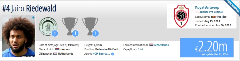 里德瓦爾德現(xiàn)年28歲,司職中場也可以踢后衛(wèi),曾效力于英超水晶宮,現(xiàn)效力于安特衛(wèi)普,德轉身價220萬歐。