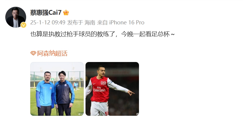 蔡惠強(qiáng)附文調(diào)侃道:“也算是執(zhí)教過(guò)槍手球員的教練了,今晚一起看足總杯~”。